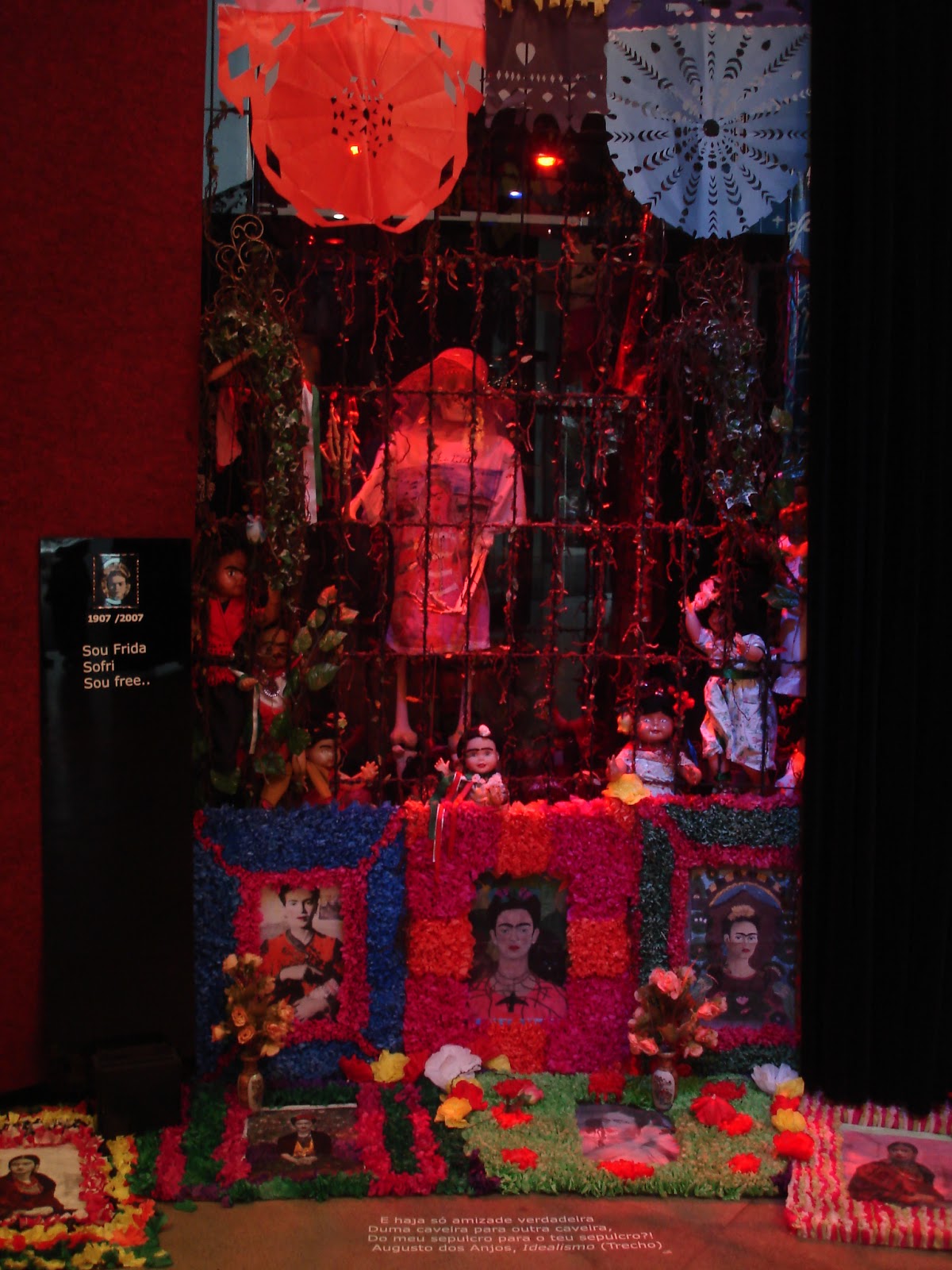representa o “Dia dos Mortos” no México, o “Altar” com flores, fotografias e santos, os “Vidros” com bonecas em conservas, que remetem